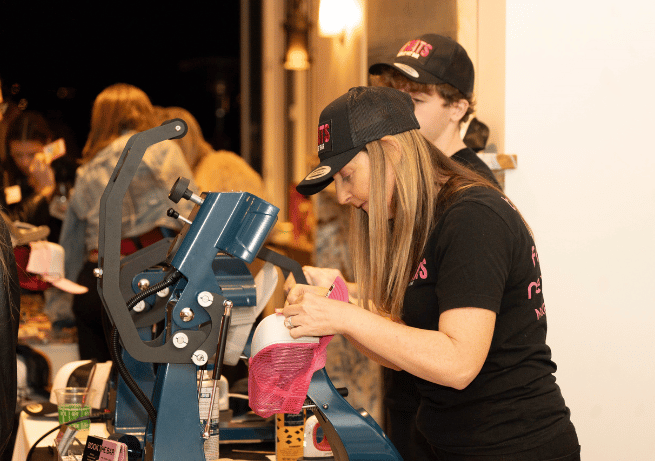 We'll help your guests create the perfect design! Some like to keep it simple, others like to get extra boujee with cute accessories! We press everything on site so your guests get to enjoy their favorite new hat there and then!